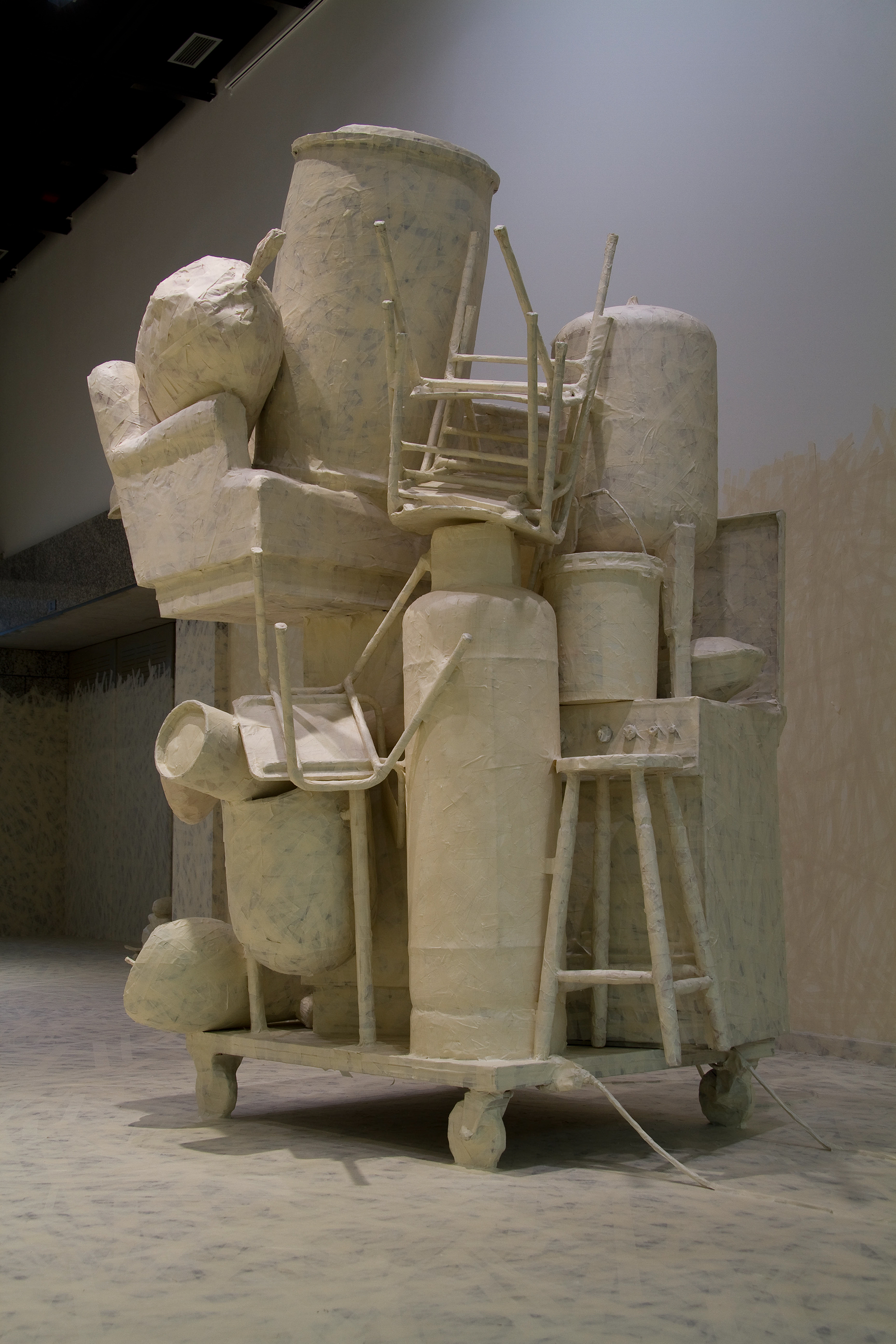 Este trabajo esta compuesto por una gran cantidad de objetos, los que han sido recubiertos al igual que los muros y el piso de la sala completamente con cinta de enmascarar (masking tape). El proyecto se articula con una serie de objetos móviles que cargan sobre ellos otros objetos que superan la lógica física de su propia estructura, lo que significa que lo único que se apoya en el suelo son ruedas, de por ejemplo: autos, patines, skates, triciclos, bicicletas, etc.