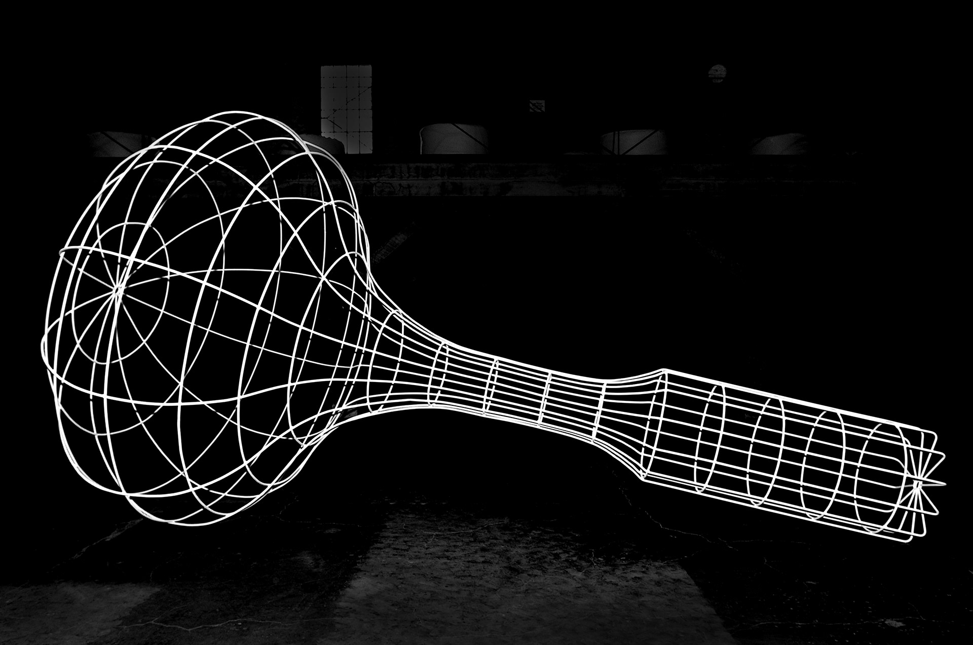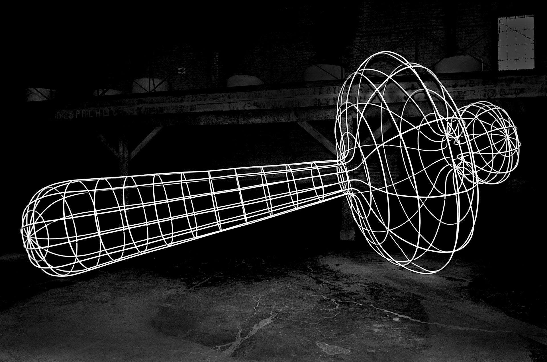 La revolución del trompo. 8 volúmenes construidos con barras de acero de 12 milímetros de diámetro soldadas y lacadas blancas. Medidas variables. 2003. Centro cultural Matucana 100, Santiago, Chile.