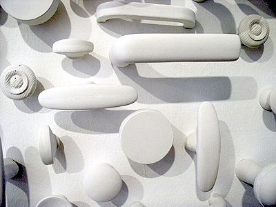 El uso del material y el color, en este caso yeso de color blanco tiene un sentido específico que dice relación con el mimetismo propio que inconscientemente le damos a estos objetos, es decir, la banalidad del objeto en su contexto domestico hace que no reparemos en él, por lo que la materialidad y el color responden a esa primicia, reinstalando de manera masiva estos objetos en un contexto plástico, pero de igual manera que en el contexto domestico (inconsciente) trabajo con el mimetismo por medio del color, materialidad y densidad.