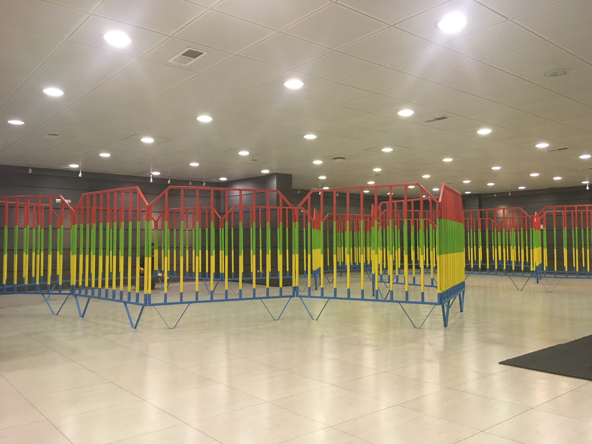 El objeto modular que compone esta estructura, es un objeto que permite de manera temporal dimensionar y determinar ciertas formas en el espacio y construir una suerte de periferia que nos deja relegados en el “exterior”. Este objeto modular que pertenece al contexto del espacio publico como sistema ordenador aquí es cuestionado, ya que el objeto ordenador pierde su función y se autodefine desde la lógica de la escultura y su relación con el espacio, desde la estética y su relación con lo cromático y con lo visual.