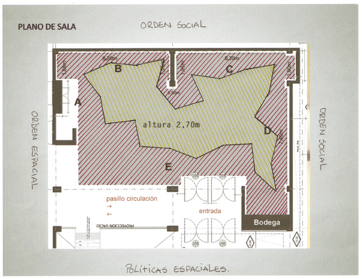 El proyecto que se exhibe en la galería de la Sala de Arte de la Universidad Mayor sede Temuco es básicamente una estrategia formal de ocupación y distribución en un espacio determinado, esta estrategia establece una relación de uso, pero a su ves estas situaciones se mimetizan construyendo una distorsión visual y una ambigüedad respecto del adentro y el afuera. Esta situación produce un una condición en la relación que tenemos con el espacio en general, y en particular con la relación del espacio de exhibiciones.