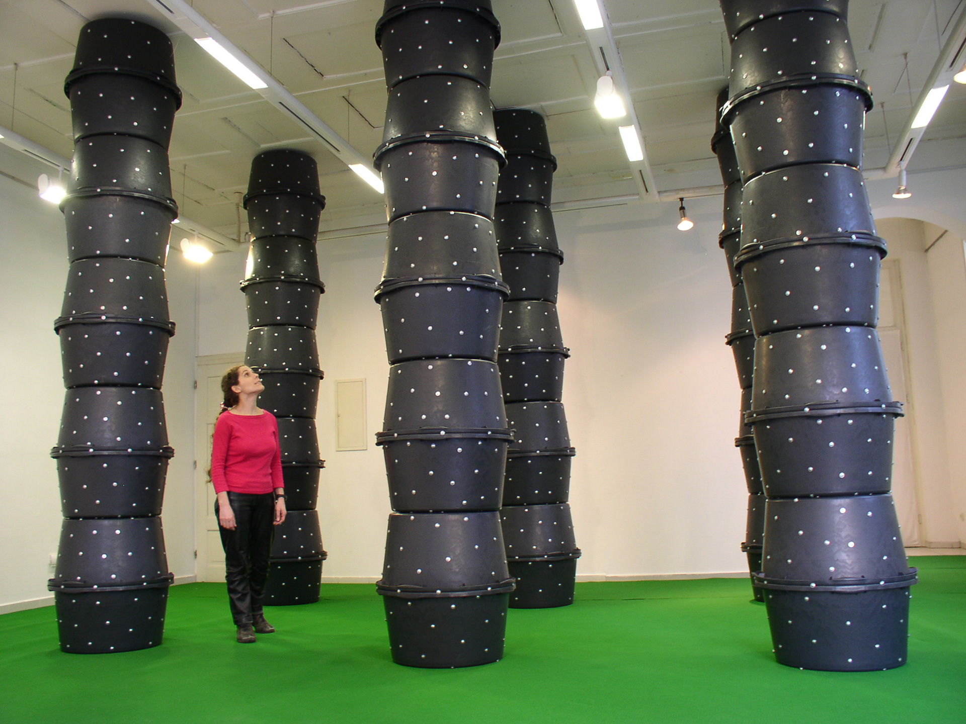 Paisaje contenido, 50 metros cuadrados de pasto sintético y 40 volúmenes realizados de polietileno negro de alta densidad con remaches de acero inoxidable, cada uno de estos volúmenes mide 70 centímetros de largo por 68 centímetros de diámetro, dimensiones variables. 2005. Kunstverein, Göttingen, Alemania.