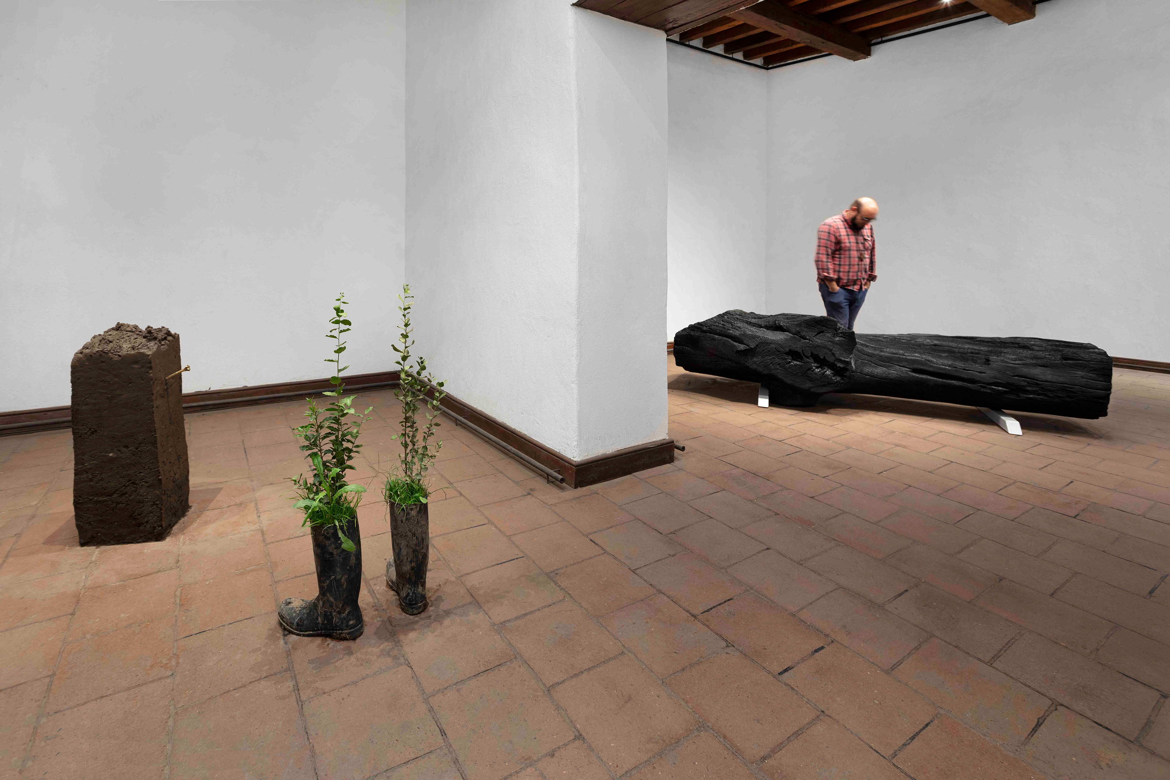 Uri. Tronco carbonizado, tierra compactada, botas de goma, árboles, piezas de bronce y dibujo a carbón sobre muro. 2022. Posada del Corregidor, Santiago de Chile.